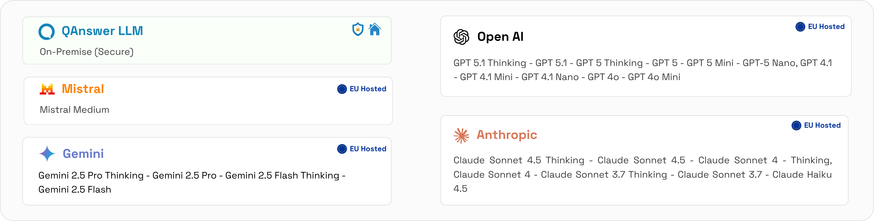 GPT-4o, Claude, Gemini or open-source — QAnswer connects to any model and routes it through infrastructure you control, in any region.