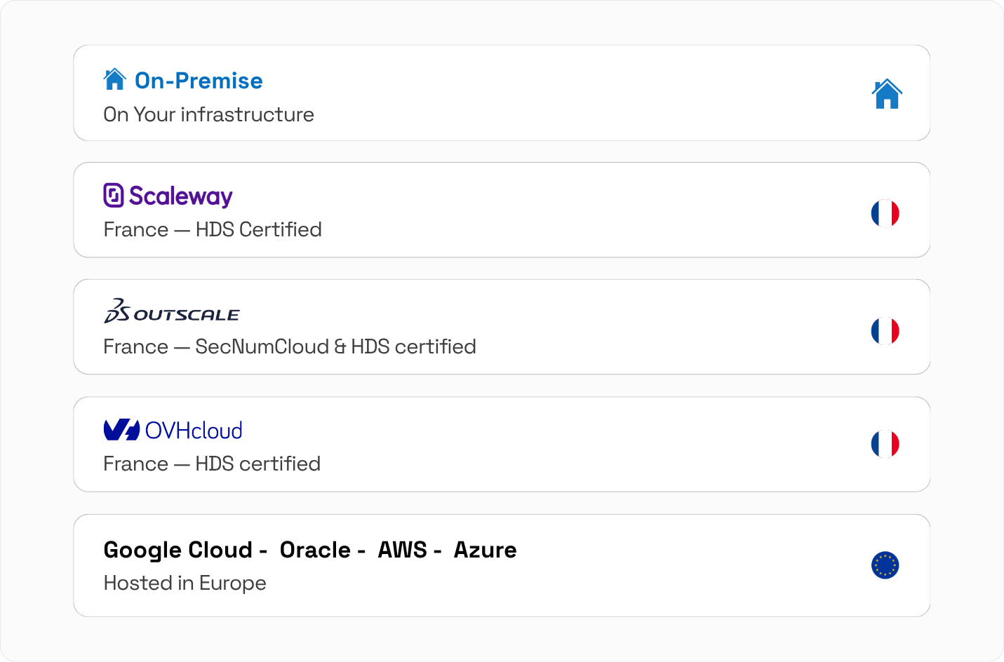French sovereign clouds, US hyperscalers, or your own datacentre. Same security model, any region, any client.